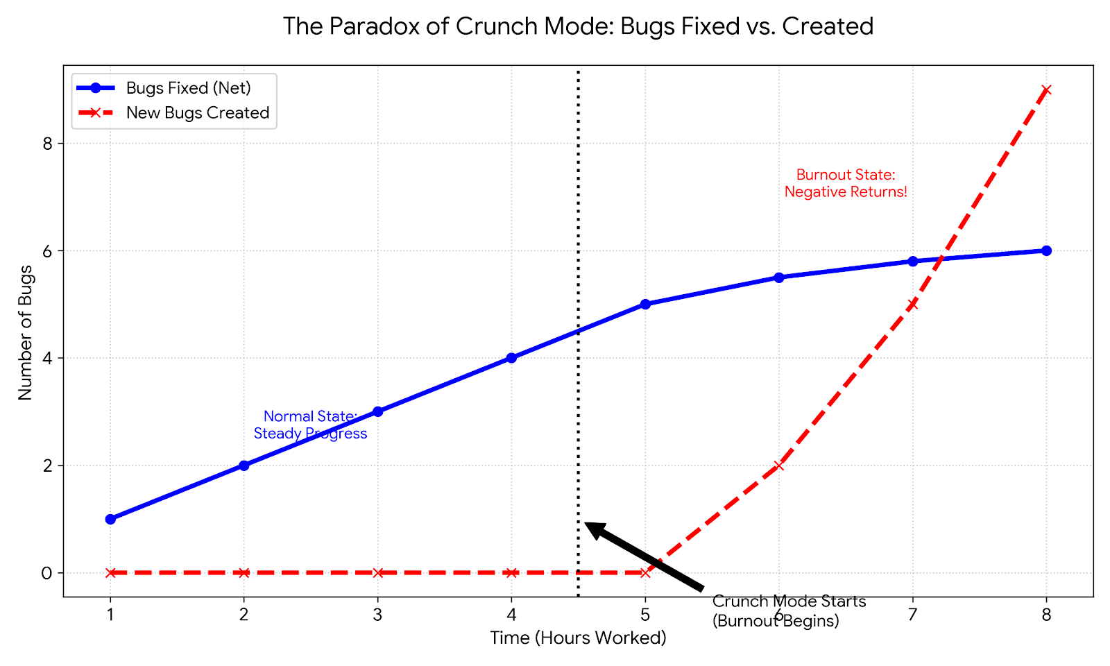 번아웃(Burnout) 상태: 1시간에 버그 1개를 잡으려다 새로운 버그 2개를 만듦.