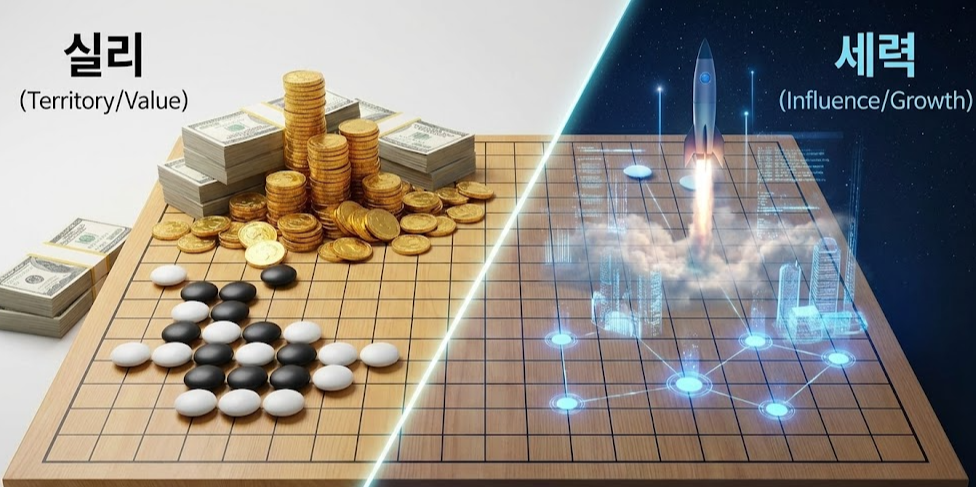 오늘은 바둑의 핵심 개념인 '실리(Territory)'와 '세력(Influence)'을 통해, 주식 투자자들의 영원한 난제인 [가치주 vs 성장주] 전략을 경영학적으로 파헤쳐 보겠습니다.