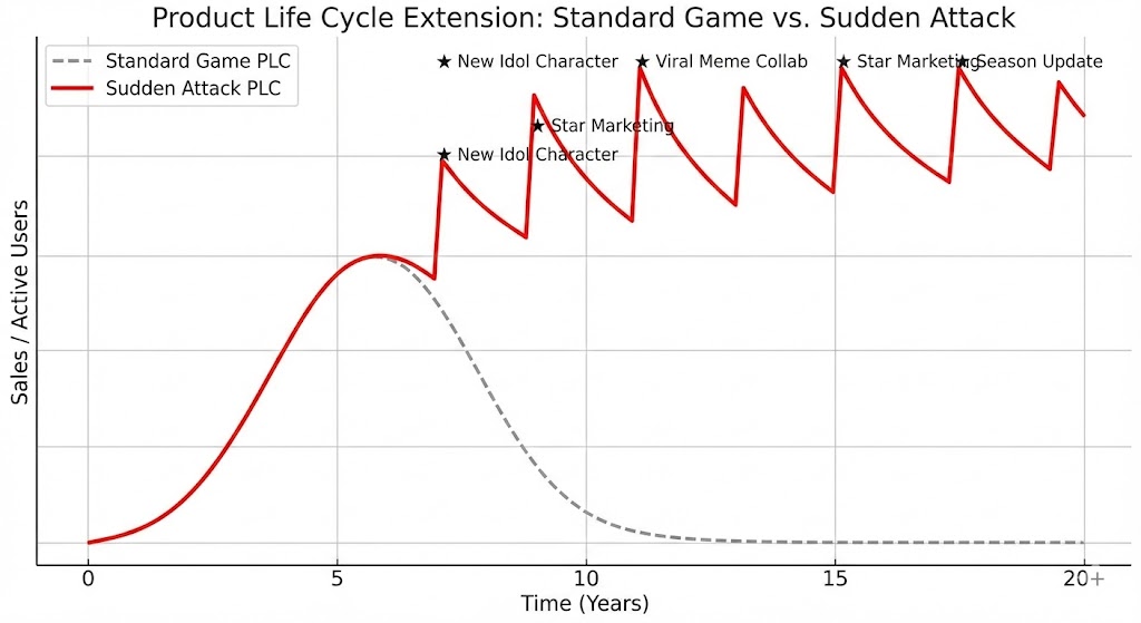 보통 게임은 출시 3~5년이면 '쇠퇴기'에 접어들어 유저가 빠지고 매출이 줄어야 정상입니다. 20년 된 서든어택은 진작에 박물관에 갔어야 하죠. 하지만 서든어택은 쇠퇴기에 접어들 때마다 강력한 '스타 마케팅'이라는 보톡스를 맞습니다.