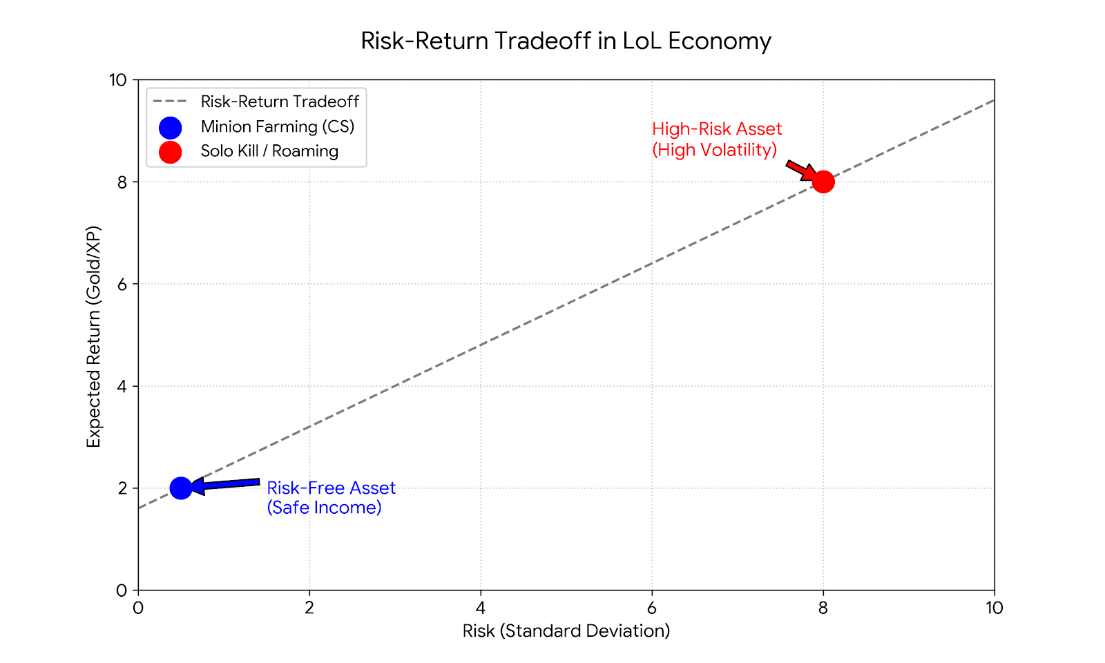킬 = 위험 자산 (High-Risk Asset): 상대를 제압해야만 얻을 수 있습니다. 성공하면 대박이지만, 실패하면(역관광/갱킹) 수익이 '0'인 것은 물론, 데스 타임 동안 엄청난 손해를 봅니다. 변동성이 극심한 '비트코인'이나 '선물 옵션'과 같습니다.