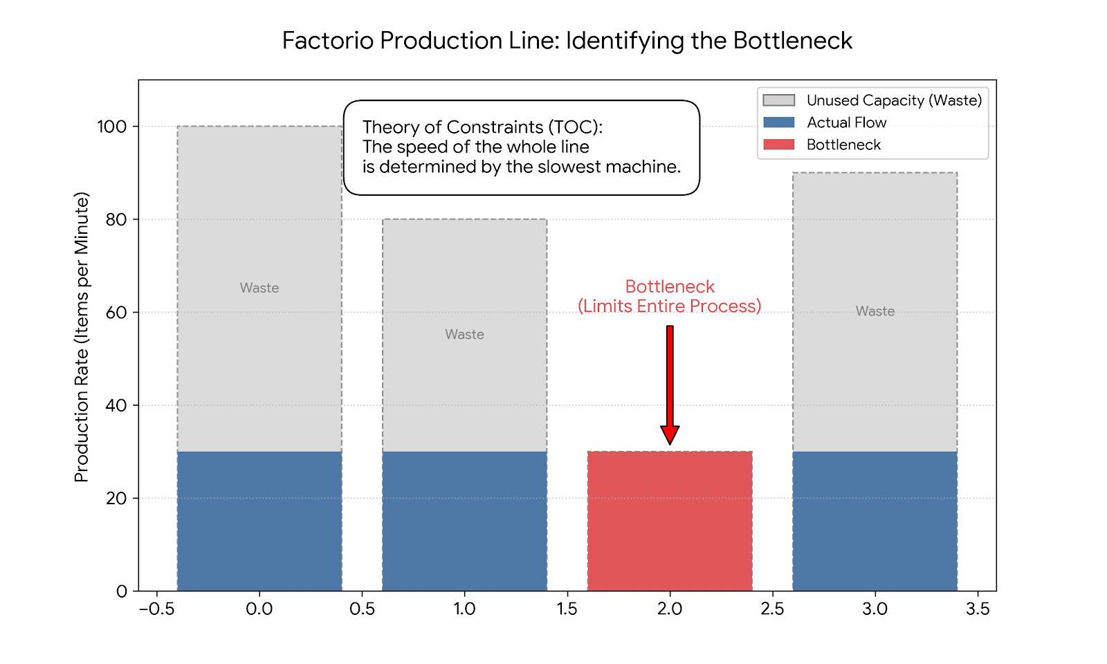 팩토리오의 교훈: 구리 전선 공급이 초당 1개라면, 뒤에 초록칩 기계를 100개를 지어도 생산량은 초당 1개입니다. 이때 초록칩 기계를 늘리는 건 자원 낭비입니다. 경영자는 무턱대고 설비를 늘리기 전에, 흐름을 막고 있는 '병목 구간(Bottleneck)'을 찾아내 그곳을 뚫어주는 데 집중해야 합니다.