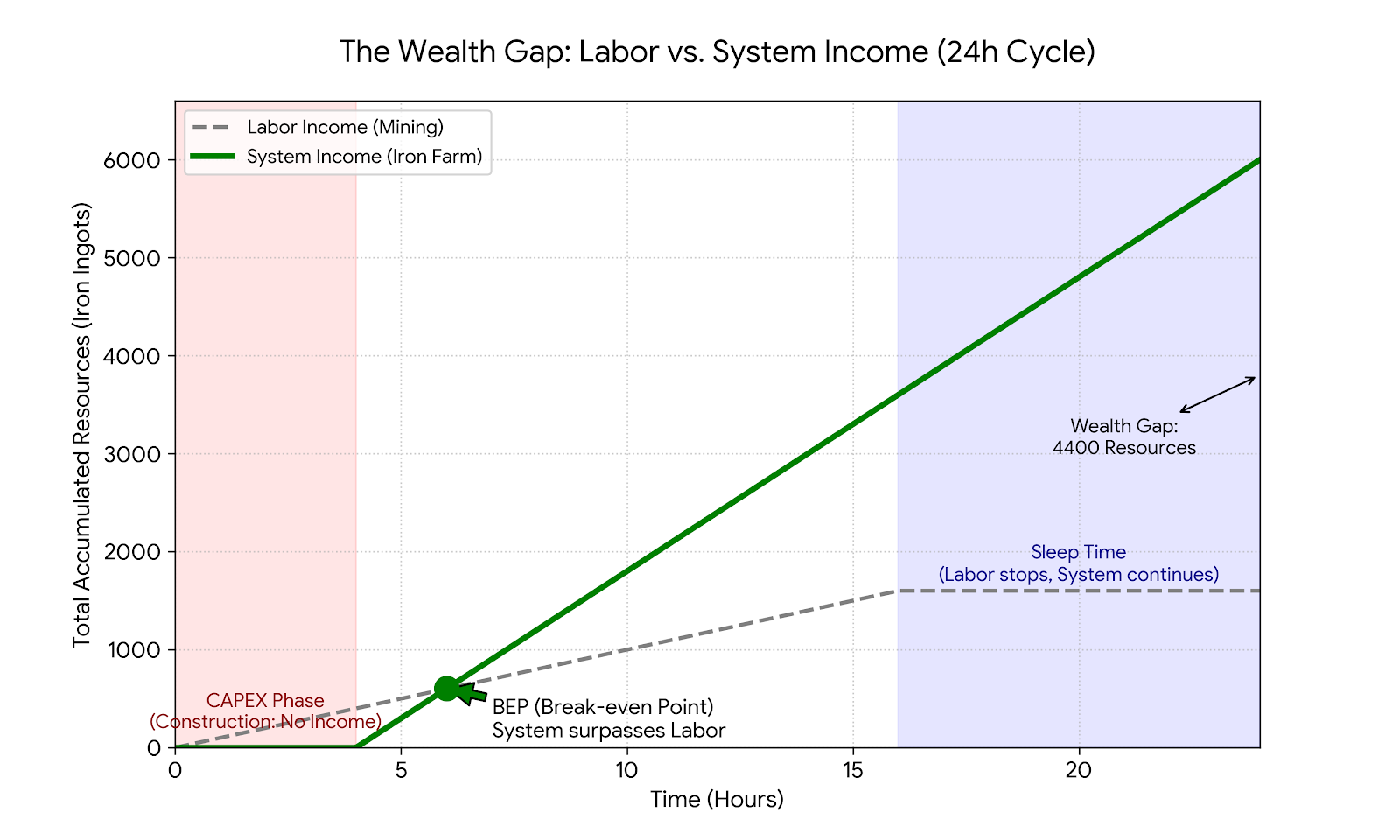 손익분기점 (Break-even Point, BEP): 하지만 계산기를 두려봐야 합니다. 농장을 짓는 데 3시간이 걸린다고 칩시다. 이 농장은 시간당 철 300개를 생산합니다. 내가 직접 캐면 시간당 100개입니다. 즉, 4.5시간만 지나면 농장이 내 노동을 앞지르는 '손익분기점'이 옵니다. 그 이후부터는? 말 그대로 '공짜'이자 '무한'의 수익입니다.