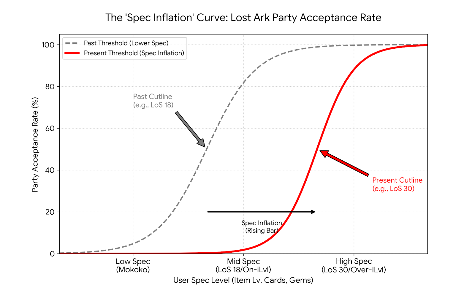 스펙 인플레이션 (Spec Inflation): 고학력자가 넘쳐나면 학위의 가치가 떨어지듯, 게임이 고일수록 유저들의 평균 스펙이 상향 평준화됩니다.