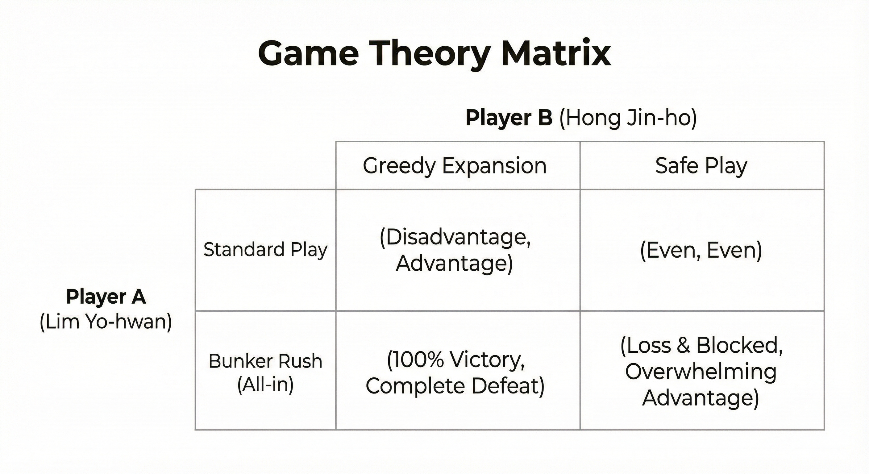 🎓 [경영학도의 노트] 게임 이론 매트릭스로 본 3연벙 위의 [보수 행렬(Payoff Matrix)] 이미지를 보시죠. 이것이 그날 임요환(A)과 홍진호(B)가 마주한 게임판입니다. A의 전략: 정석 운영 vs 벙커링(올인) B의 전략: 부유한 앞마당(방어 취약) vs 본진 플레이(방어 튼튼) 일반적인 내쉬 균형은 서로 눈치를 보며 반반씩 섞는 것이지만, 그날 임요환 선수는 상대가 '부유한 앞마당'을 선택할 수밖에 없도록 심리적으로 유도(Framing)했습니다. 상대가 '부유한 앞마당'을 선택한 상태에서, 내가 '정석 운영'을 하면 불리해지지만(자원 차이), '벙커링'을 하면 100% 승리합니다. 결국 3연벙은 단순한 '가위바위보'가 아니라, 상대방이 무엇을 낼지 강제로 고정해 놓고 주먹을 날린 완벽한 설계였던 것입니다.