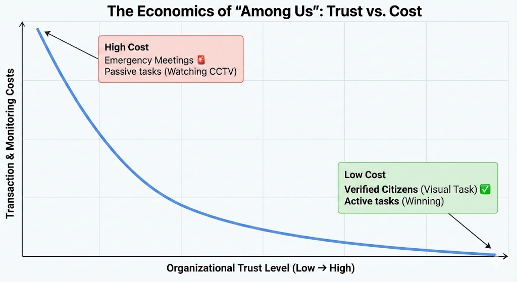 경영학의 대가인 프란시스 후쿠야마는 그의 저서 <트러스트(Trust)>에서 "신뢰는 사회적 자본이며, 고신뢰 사회일수록 거래 비용이 낮아 경제 효율성이 높다"고 주장했습니다. 반대로 불신이 가득한 조직(임포스터가 판치는 판)에서는, 누가 범인인지 찾느라(회의하느라) 실제 일은 아무것도 못 하는 마비 상태에 빠집니다.