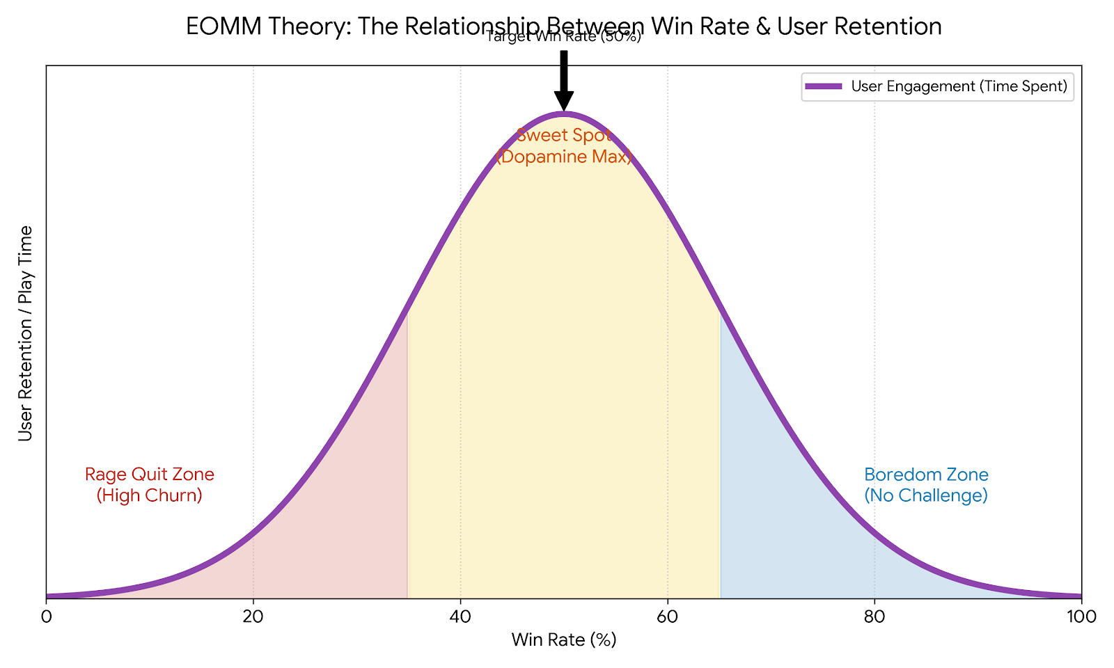원리: 유저가 가장 게임을 오래 하는 상태는 언제일까요? 계속 이길 때? 계속 질 때? 아닙니다. "이길 듯 말 듯 할 때"입니다. 너무 쉽게 이기면 지루해서 끄고(Boredom), 계속 지면 화나서 끕니다(Rage Quit).